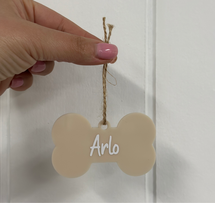 Personalised Christmas Dog Bone Acrylic Baubles Beige (with label)