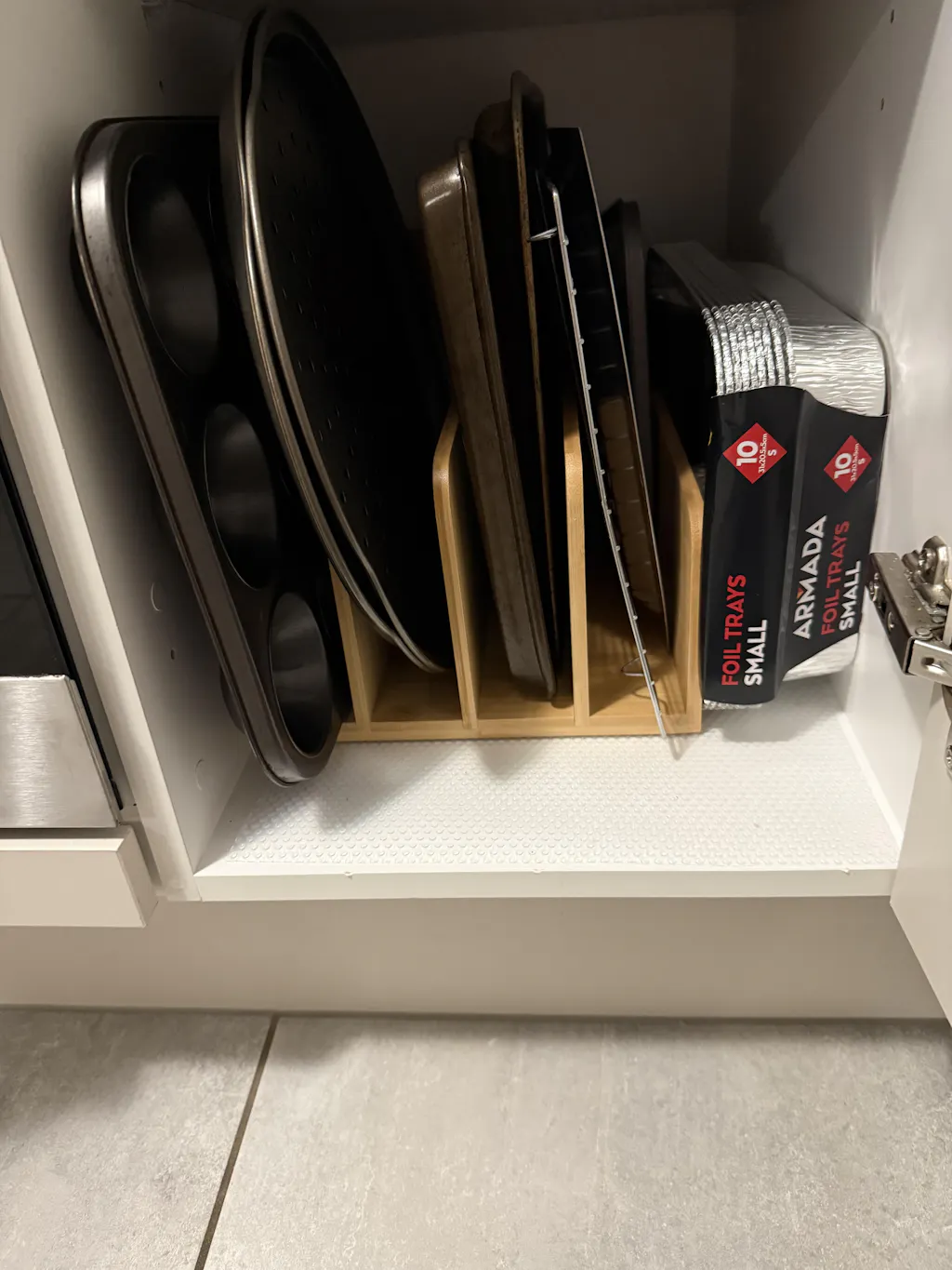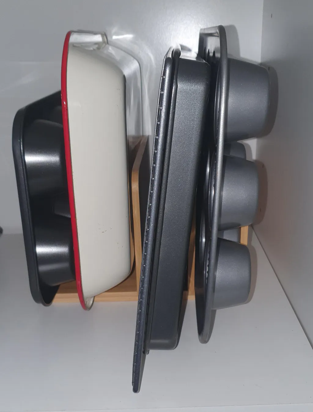 Keep your baking trays and saucepan lids organised with our bamboo organiser. This product works well in your cupboards or deep kitchen drawers.